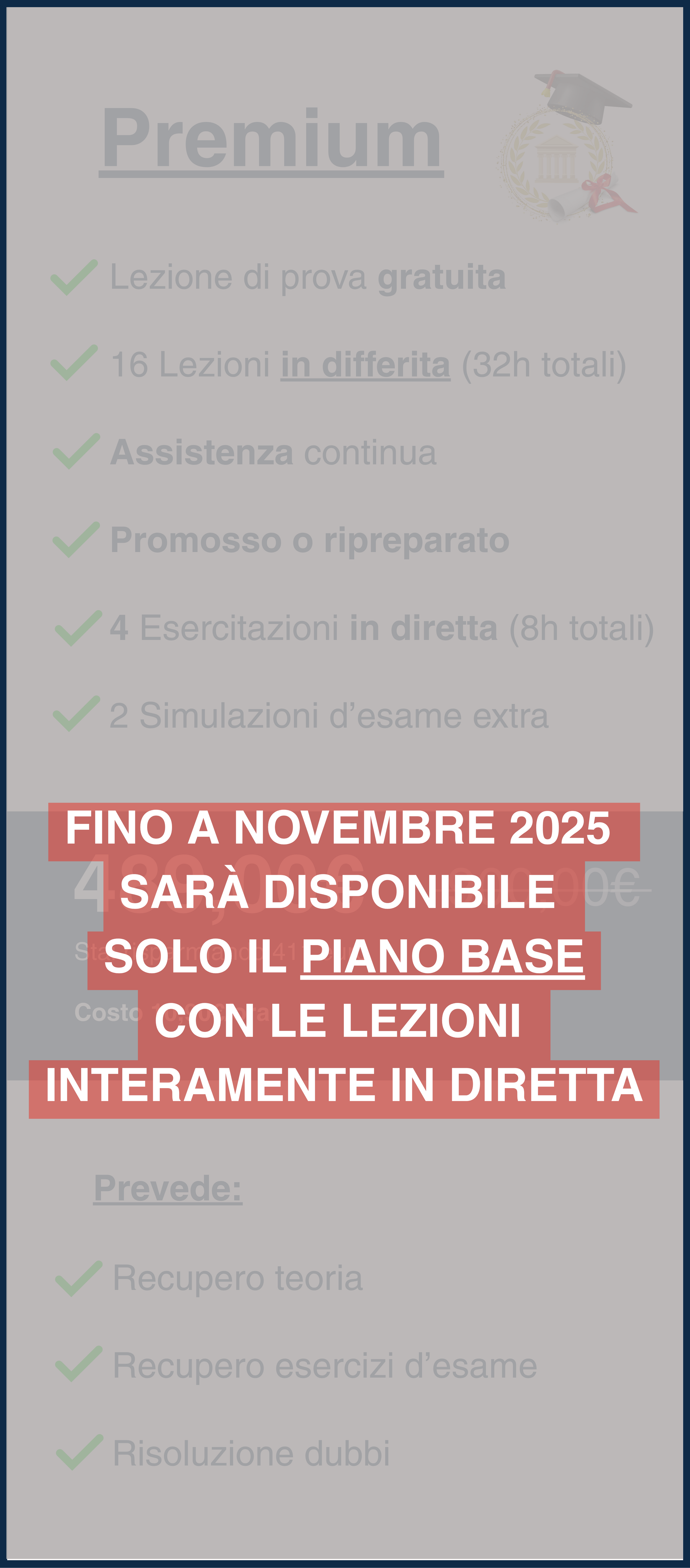 Se non superi l’esame al primo tentativo, niente panico: avrai accesso alle videoregistrazioni del corso per un anno intero.Con il piano Base le lezioni in diretta vengono registrate e caricate sulla nostra comunità didattica, dove restano disponibili per 6 mesi.