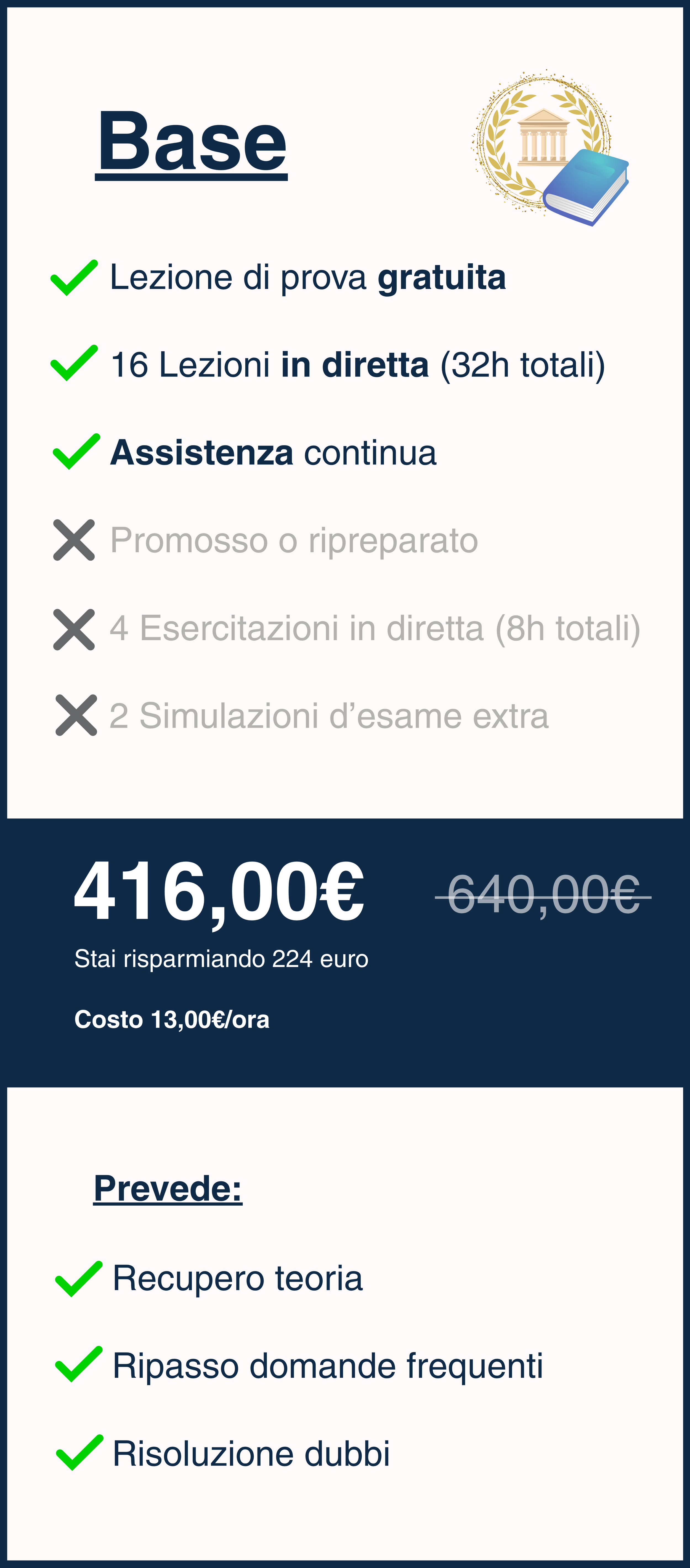 Se non superi l’esame al primo tentativo, niente panico: avrai accesso alle videoregistrazioni del corso per un anno intero.Con il piano Base le lezioni in diretta vengono registrate e caricate sulla nostra comunità didattica, dove restano disponibili per 6 mesi.