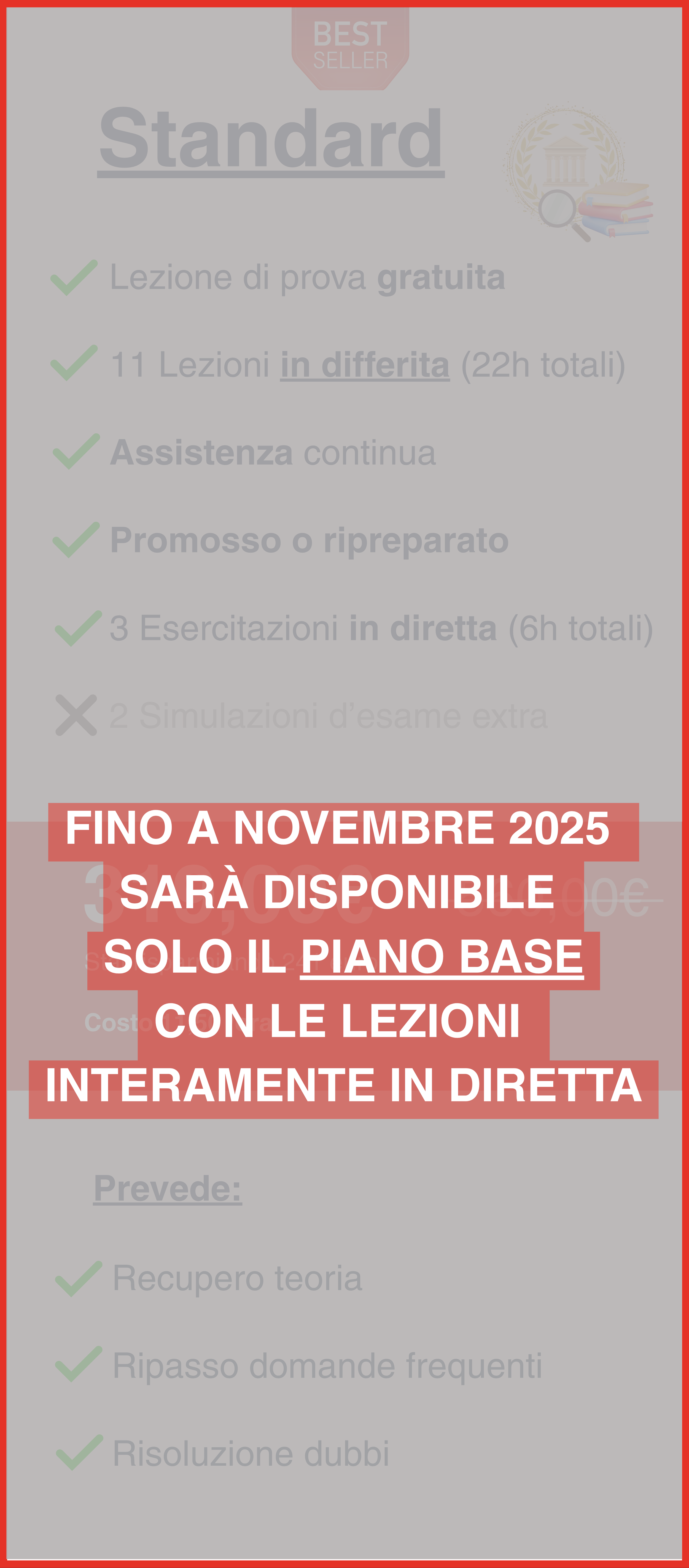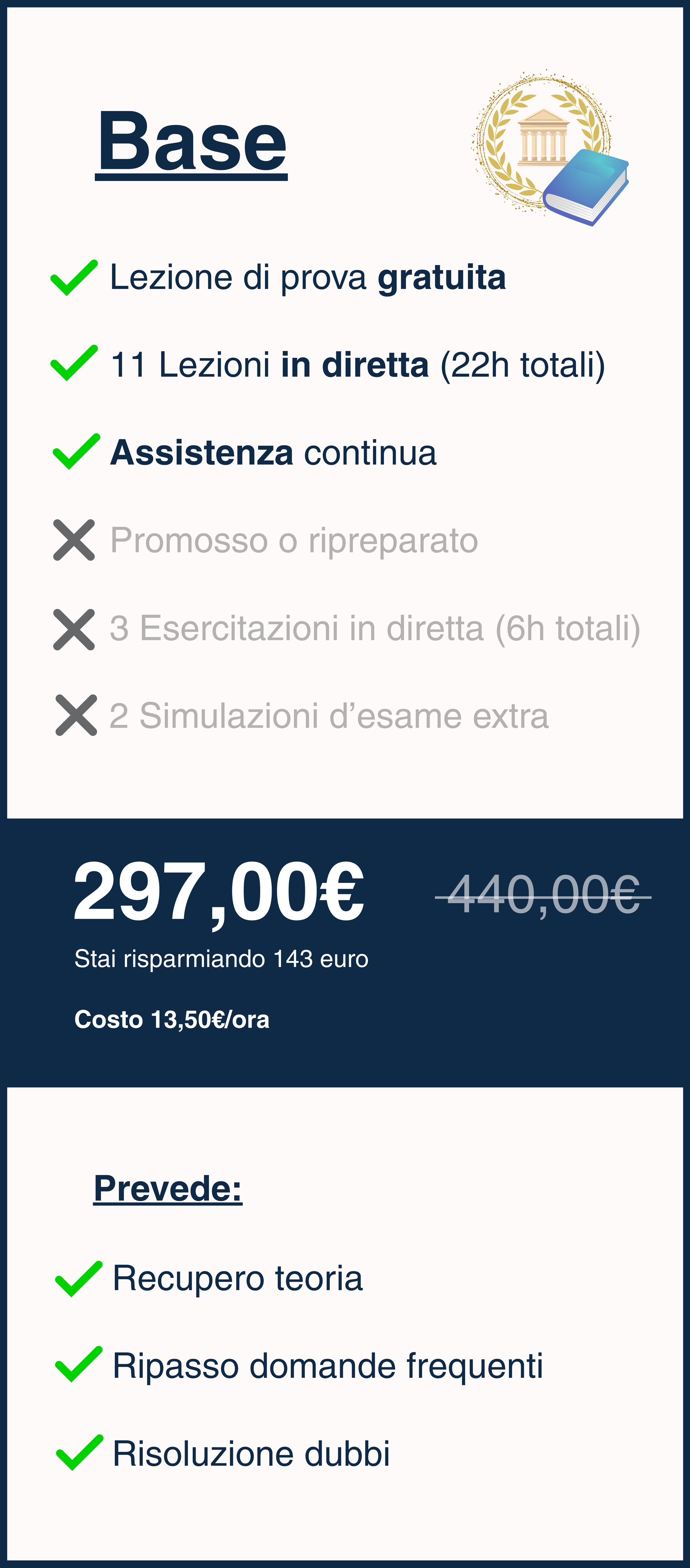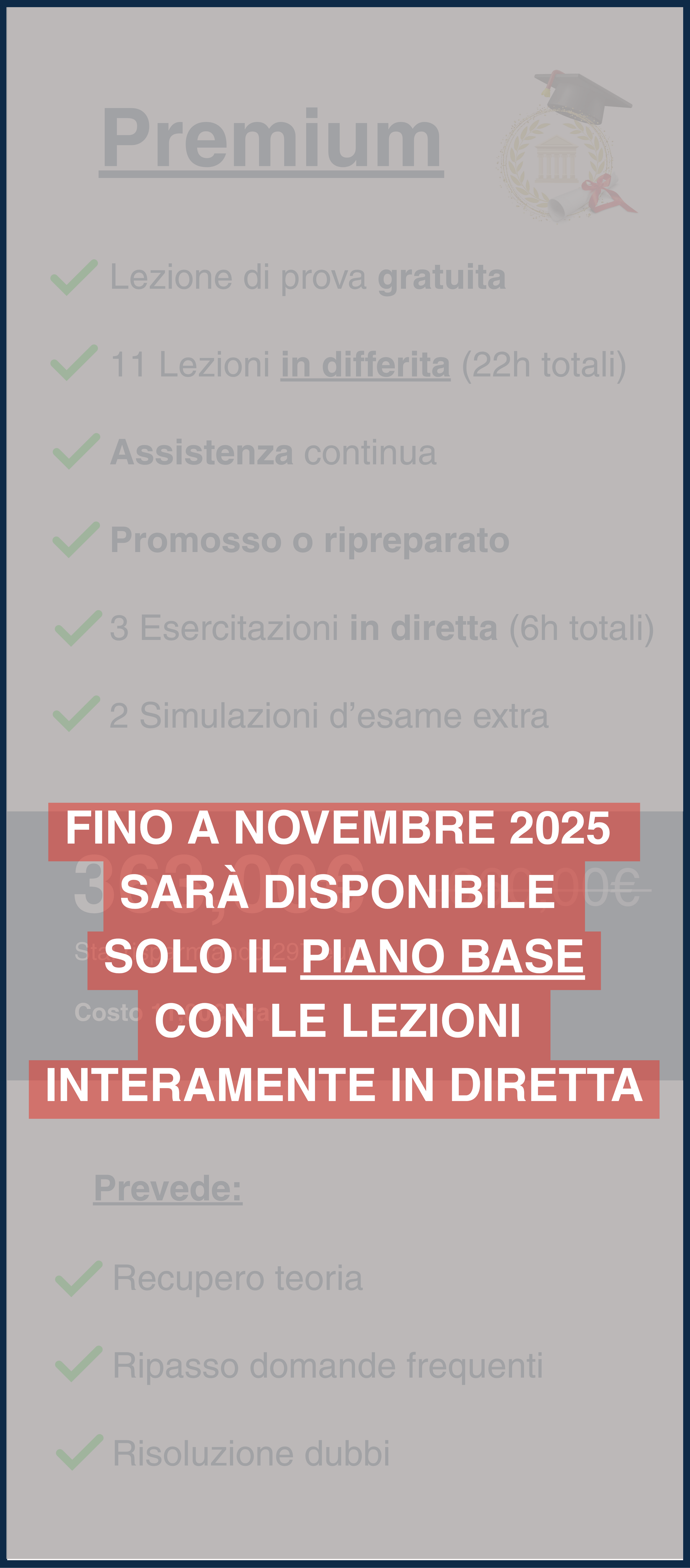 Se non superi l’esame al primo tentativo, niente panico: avrai accesso alle videoregistrazioni del corso per un anno intero.Con il piano Base le lezioni in diretta vengono registrate e caricate sulla nostra comunità didattica, dove restano disponibili per 6 mesi.