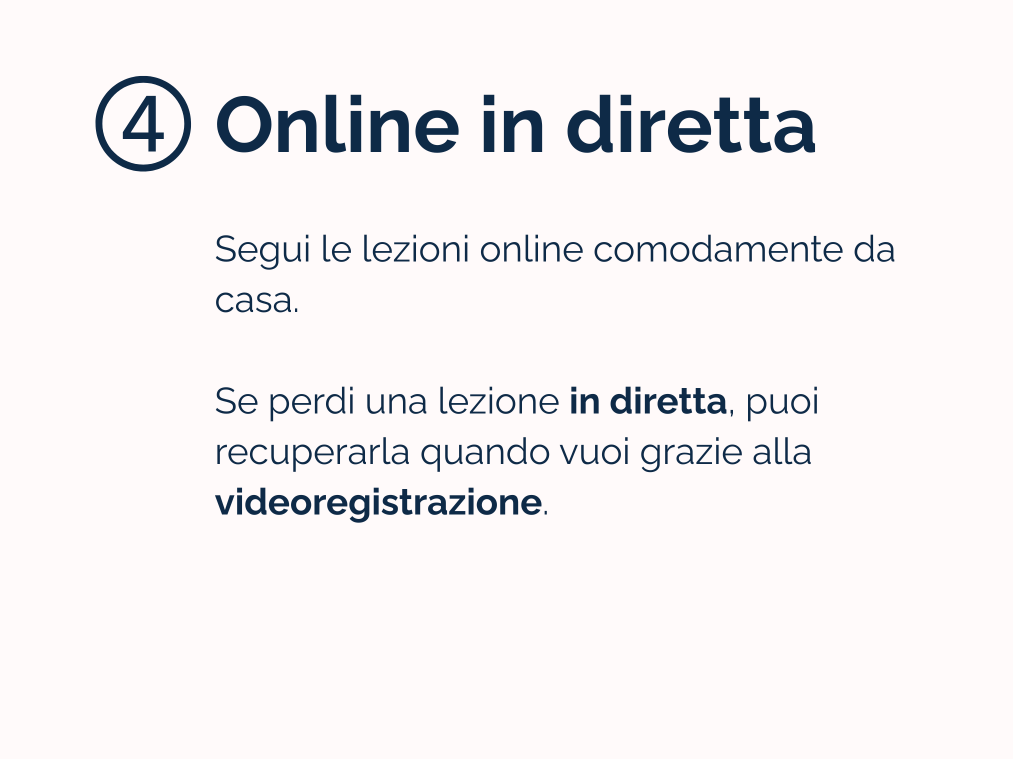 Tutte le lezioni in diretta verranno registrate e rese disponibili agli iscritti, così potrai riguardarle quando vuoi, tutte le volte che ne avrai bisogno.
