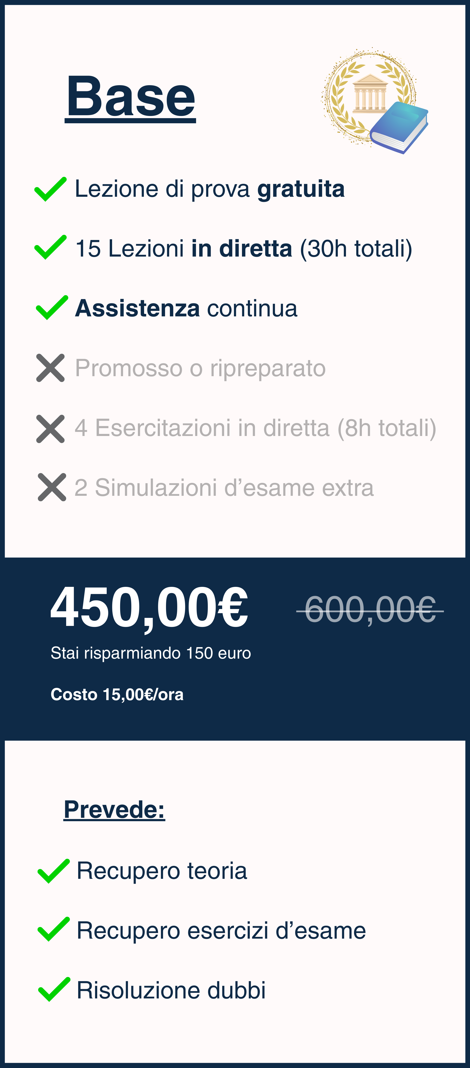 Se non superi l’esame al primo tentativo, niente panico: avrai accesso alle videoregistrazioni del corso per un anno intero.Con il piano Base le lezioni in diretta vengono registrate e caricate sulla nostra comunità didattica, dove restano disponibili per 6 mesi.